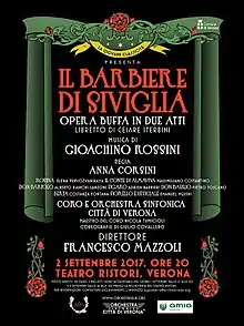 - Opéra : Il Barbiere di Siviglia, à Vérone, 2 septembre 2017. Œuvre intégrale de Gioachino Rossini, sur le livret de Cesare Sterbini, enrichie d'un ballet de la Compagnia giovanile di danza Operamoderna. Nouvelle mise en scène de Anna Corsini. Orchestre symphonique Città di Verona[61],[62].