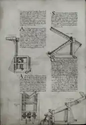 - Traité I, concernant l'architecture, des machines, des écluses, des barrages, des aqueducs souterrains et de l'art militaire, datant probablement de la période 1478-1481: Le manuscrit Ashburnham no 361 (Bibliothèque Laurentienne)[14] et le codex Saluzziano no 148 (Bibliothèque royale de Turin)[15]. Le manuscrit Ashburnham est incomplet et contient essentiellement la partie mécanique du traité, mais son intérêt vient de ce qu'il a été annoté par Léonard de Vinci.