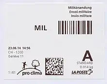 En Suisse, l'envoi de courrier militaire en franchise de port ne nécessite pas de timbre, il suffit d'indiquer sur l'adresse un numéro d'acheminement militaire et d'indiquer sur l'enveloppe "poste militaire" si l'envoi est déposé en boîtes aux lettres postale ou de l'indiquer verbalement si cela est fait au guichet, la poste apposant après dépôt elle-même la mention "envoi militaire". L'unité militaire responsable de l'acheminement du courrier au sein de l'armée suisse est la "poste de campagne", en abrégé "PCamp".