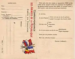 - En 1914-18, des cartes en franchise, avec mention « F.M. », les unes officielles, et les autres d'origine privée, furent mises à la disposition de nos soldats, sans leur apporter la moindre franchise, puisqu'ils y avaient droit de toute façon en écrivant « F.M. » sur n'importe quel papier à lettres. Ce système de cartes « F.M. » fut repris en 1939-45, puis pendant la guerre d'Algérie, mais de façon plus limitée (cf. Entier postal).