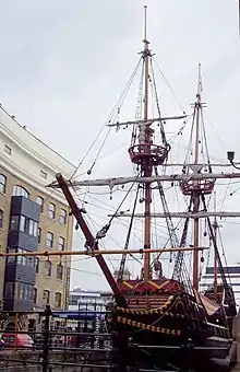 Le , Élisabeth Ire monte à bord du Golden Hind, alors à quai à Deptford, et demande au diplomate français, monsieur de Marchaumont, de prêter son épée pour adouber Drake ; Marchaumont se trouvant sur place pour négocier le mariage entre Élisabeth et le frère du roi de France, le duc d'Anjou[27],[28]. En impliquant un diplomate français dans l'adoubement de Drake, Élisabeth obtient le soutien implicite de la France concernant les agissements de Drake[29],[30]. Les historiens de l'ère victorienne, par souci nationaliste, attribuent l'adoubement[28],[31] à Élisabeth Ire .