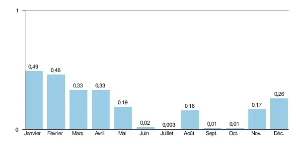 La moyenne mensuelle interannuelle sur la période d'observation est alors de 0,20 m3/s[2].