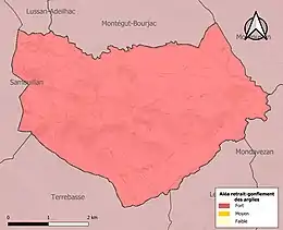 Le retrait-gonflement des sols argileux est susceptible d'engendrer des dommages importants aux bâtiments en cas d’alternance de périodes de sécheresse et de pluie. La totalité de la commune est en aléa moyen ou fort (88,8 % au niveau départemental et 48,5 % au niveau national). Sur les 113 bâtiments dénombrés sur la commune en 2019, 113 sont en aléa moyen ou fort, soit 100 %, à comparer aux 98 % au niveau départemental et 54 % au niveau national. Une cartographie de l'exposition du territoire national au retrait gonflement des sols argileux est disponible sur le site du BRGM[29],[Carte 3].