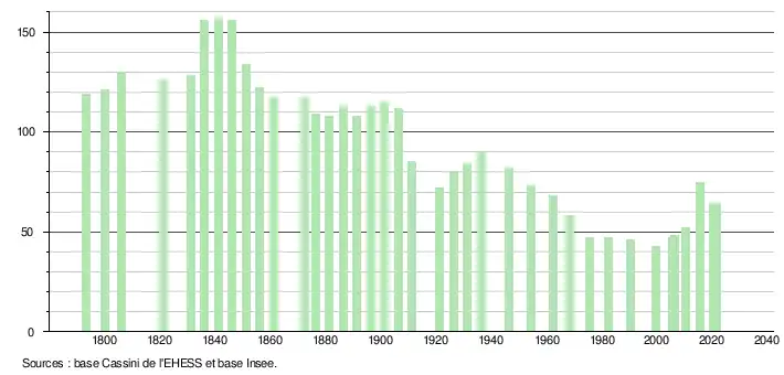 L'évolution du nombre d'habitants est connue à travers les recensements de la population effectués dans la commune depuis 1793. Pour les communes de moins de 10 000 habitants, une enquête de recensement portant sur toute la population est réalisée tous les cinq ans, les populations légales des années intermédiaires étant quant à elles estimées par interpolation ou extrapolation[19]. Pour la commune, le premier recensement exhaustif entrant dans le cadre du nouveau dispositif a été réalisé en 2005[20].