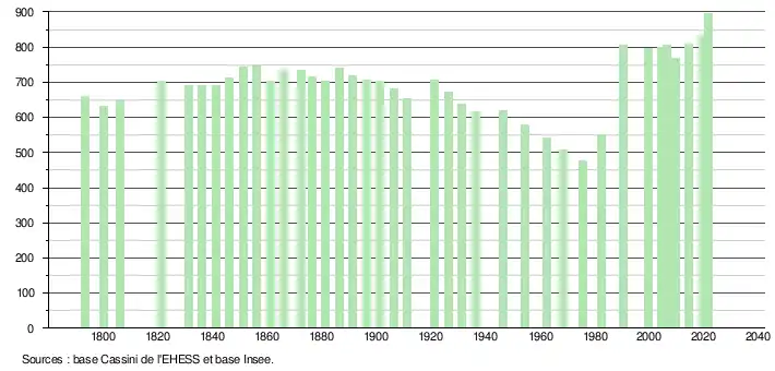 L'évolution du nombre d'habitants est connue à travers les recensements de la population effectués dans la commune depuis 1793. Pour les communes de moins de 10 000 habitants, une enquête de recensement portant sur toute la population est réalisée tous les cinq ans, les populations légales des années intermédiaires étant quant à elles estimées par interpolation ou extrapolation[24]. Pour la commune, le premier recensement exhaustif entrant dans le cadre du nouveau dispositif a été réalisé en 2004[25].