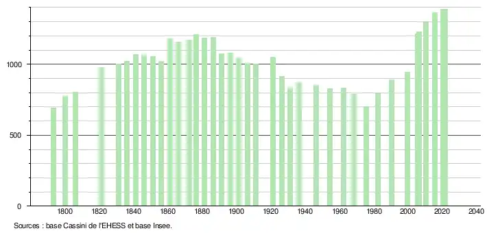 L'évolution du nombre d'habitants est connue à travers les recensements de la population effectués dans la commune depuis 1793. Pour les communes de moins de 10 000 habitants, une enquête de recensement portant sur toute la population est réalisée tous les cinq ans, les populations légales des années intermédiaires étant quant à elles estimées par interpolation ou extrapolation[27]. Pour la commune, le premier recensement exhaustif entrant dans le cadre du nouveau dispositif a été réalisé en 2005[28].