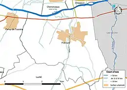 Le Cher, d'une longueur totale de 365,5 km, prend sa source à 714 mètres d'altitude à Mérinchal, dans la Creuse et se jette dans la Loire à Villandry, à 40 m d'altitude, après avoir traversé 117 communes[3]. Le Cher présente des fluctuations saisonnières de débit assez marquées. Sur le plan de la prévision des crues, la commune est située dans le tronçon du Cher tourangeau[4], dont la station hydrométrique de référence la plus proche est située à Tours [Pont Saint Sauveur]. Le débit mensuel moyen (calculé sur 53 ans pour cette station) varie de 25,8 m3/s au mois d'août à 192 m3/s au mois de février. Le débit instantané maximal observé sur cette station est de 1 000 m3/s le , la hauteur maximale relevée a été de 4,96 m le [5],[6]. Ce cours d'eau est classé dans les listes 1[Note 1] et 2[Note 2] au titre de l'article L. 214-17 du code de l'environnement sur le Bassin Loire-Bretagne. Au titre de la liste 1, aucune autorisation ou concession ne peut être accordée pour la construction de nouveaux ouvrages s'ils constituent un obstacle à la continuité écologique et le renouvellement de la concession ou de l'autorisation des ouvrages existants est subordonné à des prescriptions permettant de maintenir le très bon état écologique des eaux. Au titre de la liste 2, tout ouvrage doit être géré, entretenu et équipé selon des règles définies par l'autorité administrative, en concertation avec le propriétaire ou, à défaut, l'exploitant[7],[8]. Sur le plan piscicole, le Cher est classé en deuxième catégorie piscicole. Le groupe biologique dominant est constitué essentiellement de poissons blancs (cyprinidés) et de carnassiers (brochet, sandre et perche)[9].