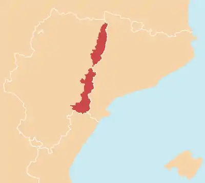 - dans la province de Teruel : Aguaviva de Bergantes, Aréns de Lledó, Beceite, Belmonte de San José, Calaceite, La Cañada de Verich, La Cerollera, La Codoñera, Cretas, Fórnoles, La Fresneda, Fuentespalda, La Ginebrosa, Lledó, Mazaleón, Monroyo, Peñarroya de Tastavins, La Portellada, Ráfales, Torre de Arcas, Torre del Compte, Torrevelilla, Valderrobres, Valdeltormo et Valjunquera.