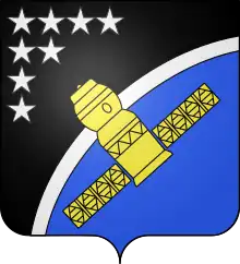 De sable, à un globe d'azur bordé d'argent mouvant de l'angle sénestre de la pointe et accompagné en chef-dextre de huit étoiles d'argent ordonnées 4, 2, 1 & 1et à une capsule spatiale d'or brochant en bande sur le globe ou De sable à un tourteau d'azur bordé d'argent mouvant de la pointe et du flanc senestre, accompagné au chef dextre de huit étoiles d'argent ordonnées en Northrop B-2 Spirit posé en bande, à une capusle Soyouz d'or posée en bande brochante en abîme |