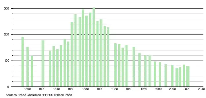 L'évolution du nombre d'habitants est connue à travers les recensements de la population effectués dans la commune depuis 1793. Pour les communes de moins de 10 000 habitants, une enquête de recensement portant sur toute la population est réalisée tous les cinq ans, les populations légales des années intermédiaires étant quant à elles estimées par interpolation ou extrapolation[15]. Pour la commune, le premier recensement exhaustif entrant dans le cadre du nouveau dispositif a été réalisé en 2005[16].