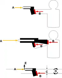 La pression des gaz de propulsion pousse vers l'arrière selon l'axe du canon (A). Le tireur exerce une force opposée (B) au niveau de la poignée (et éventuellement de la crosse). L'axe du canon et le point de contact moyen du tireur présentent une différence de hauteur (C). Les forces A et B créent donc un moment (D), qui fait tourner l'arme en relevant son canon (E).
