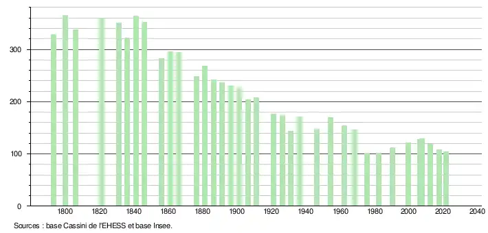 L'évolution du nombre d'habitants est connue à travers les recensements de la population effectués dans la commune depuis 1793. Pour les communes de moins de 10 000 habitants, une enquête de recensement portant sur toute la population est réalisée tous les cinq ans, les populations légales des années intermédiaires étant quant à elles estimées par interpolation ou extrapolation[20]. Pour la commune, le premier recensement exhaustif entrant dans le cadre du nouveau dispositif a été réalisé en 2007[21].