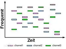 Dans les normes 802.11 initiales (publiées en 1997 et 1999), la bande de fréquence 2,4 - 2,485 GHz permettait de créer jusqu'à 79 canaux de 1 MHz chacun[4]. La transmission se faisait ainsi, à l'aide des méthodes FHSS ou DSSS, en émettant successivement sur un canal puis sur un autre pendant une courte période de temps (maximum 400 ms) en utilisant une combinaison, connue de toutes les stations, d'une partie des canaux regroupés dans une bande de 80 MHz (22 MHz en mode DSSS), ce qui permet à un instant donné de transmettre un signal facilement reconnaissable sur une fréquence donnée. Les versions plus récentes des normes 802.11 (g, n, ac et ax) utilisent d'autres méthodes de codage sans « saut de fréquence », mais permettant des débits plus élevés : l'OFDM et l'OFDMA.