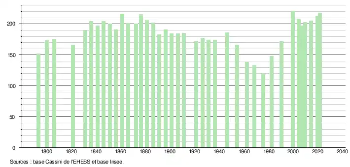 L'évolution du nombre d'habitants est connue à travers les recensements de la population effectués dans la commune depuis 1793. Pour les communes de moins de 10 000 habitants, une enquête de recensement portant sur toute la population est réalisée tous les cinq ans, les populations légales des années intermédiaires étant quant à elles estimées par interpolation ou extrapolation[23]. Pour la commune, le premier recensement exhaustif entrant dans le cadre du nouveau dispositif a été réalisé en 2004[24].