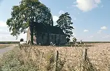 La mare et l'église Saint-Just-et-Sainte-Anne de Fresnay-le-Gilmert en 1972. | |||||