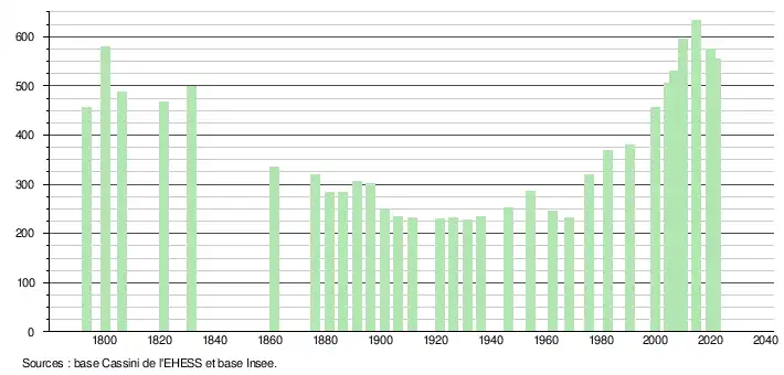 L'évolution du nombre d'habitants est connue à travers les recensements de la population effectués dans la commune depuis 1793. Pour les communes de moins de 10 000 habitants, une enquête de recensement portant sur toute la population est réalisée tous les cinq ans, les populations légales des années intermédiaires étant quant à elles estimées par interpolation ou extrapolation[18]. Pour la commune, le premier recensement exhaustif entrant dans le cadre du nouveau dispositif a été réalisé en 2004[19].