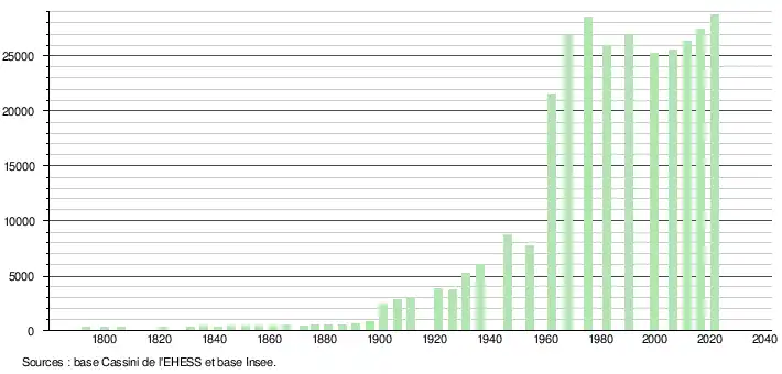 - Par convention dans Wikipédia, le principe a été retenu de n’afficher dans le tableau des recensements et le graphique, pour les populations légales postérieures à 1999, que les populations correspondant à une enquête exhaustive de recensement pour les communes de moins de 10 000 habitants, et que les populations des années 2006, 2011, 2016, etc. pour les communes de plus de 10 000 habitants, ainsi que la dernière population légale publiée par l’Insee pour l'ensemble des communes.