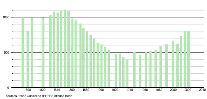 L'évolution du nombre d'habitants est connue à travers les recensements de la population effectués dans la commune depuis 1793. Pour les communes de moins de 10 000 habitants, une enquête de recensement portant sur toute la population est réalisée tous les cinq ans, les populations légales des années intermédiaires étant quant à elles estimées par interpolation ou extrapolation[23]. Pour la commune, le premier recensement exhaustif entrant dans le cadre du nouveau dispositif a été réalisé en 2005[24].