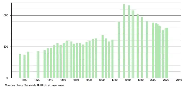 L'évolution du nombre d'habitants est connue à travers les recensements de la population effectués dans la commune depuis 1793. Pour les communes de moins de 10 000 habitants, une enquête de recensement portant sur toute la population est réalisée tous les cinq ans, les populations légales des années intermédiaires étant quant à elles estimées par interpolation ou extrapolation[34]. Pour la commune, le premier recensement exhaustif entrant dans le cadre du nouveau dispositif a été réalisé en 2004[35].