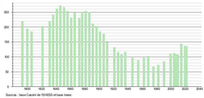 L'évolution du nombre d'habitants est connue à travers les recensements de la population effectués dans la commune depuis 1793. Pour les communes de moins de 10 000 habitants, une enquête de recensement portant sur toute la population est réalisée tous les cinq ans, les populations légales des années intermédiaires étant quant à elles estimées par interpolation ou extrapolation[32]. Pour la commune, le premier recensement exhaustif entrant dans le cadre du nouveau dispositif a été réalisé en 2004[33].