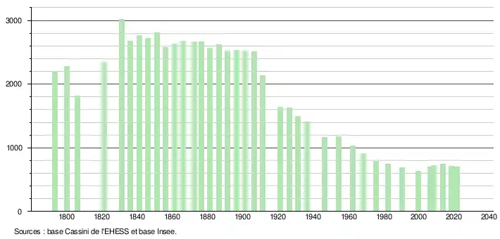 L'évolution du nombre d'habitants est connue à travers les recensements de la population effectués dans la commune depuis 1793. Pour les communes de moins de 10 000 habitants, une enquête de recensement portant sur toute la population est réalisée tous les cinq ans, les populations légales des années intermédiaires étant quant à elles estimées par interpolation ou extrapolation[34]. Pour la commune, le premier recensement exhaustif entrant dans le cadre du nouveau dispositif a été réalisé en 2008[35].
