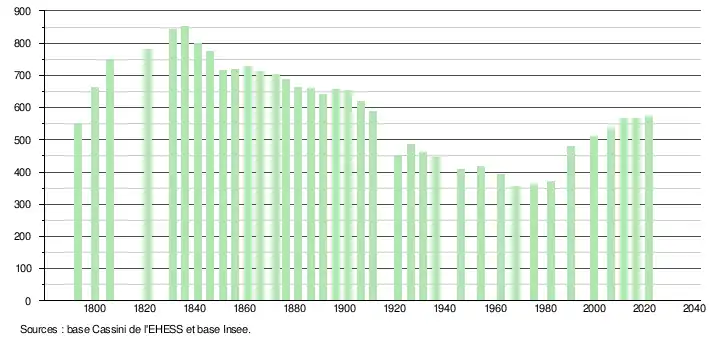 L'évolution du nombre d'habitants est connue à travers les recensements de la population effectués dans la commune depuis 1793. Pour les communes de moins de 10 000 habitants, une enquête de recensement portant sur toute la population est réalisée tous les cinq ans, les populations légales des années intermédiaires étant quant à elles estimées par interpolation ou extrapolation[27]. Pour la commune, le premier recensement exhaustif entrant dans le cadre du nouveau dispositif a été réalisé en 2006[28].