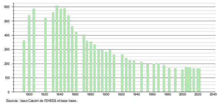L'évolution du nombre d'habitants est connue à travers les recensements de la population effectués dans la commune depuis 1793. Pour les communes de moins de 10 000 habitants, une enquête de recensement portant sur toute la population est réalisée tous les cinq ans, les populations légales des années intermédiaires étant quant à elles estimées par interpolation ou extrapolation[19]. Pour la commune, le premier recensement exhaustif entrant dans le cadre du nouveau dispositif a été réalisé en 2004[20].