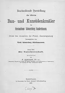 • Beschreibende Darstellung der älteren Bau- und Kunstdenkmäler des Fürstenthums Schwarzburg-Sondershausen. Unter den Auspicien der Fürstl. Staatsregierung herausgegeben vom Fürstl. Schwarzburg. Alterthumsverein. Erstes Heft: Die Unterherrschaft. Sondershausen 1886. Zweites Heft: Die Oberherrschaft. ebenda 1887. Digitalisat. (Neudrucke 1993, (ISBN 3861620138) und 1991, (ISBN 3861620073).)