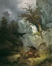 Friedrich Gauermann est connu comme un peintre paysagiste du mouvement Biedermeier. Il refuse le védutisme et s'intéresse au primitif flamand, ce qui donne un style naturaliste. Après une grande exposition en 1830, il commence ses paysages de montagne et de forêt avec des animaux. Jusque dans les années 1840, il reçoit de nombreuses commandes de l'aristocratie viennoise (Metternich, Schwarzenberg, Liechtenstein). Après 1848, les clients sont moins nombreux. Il se laisse influencer par l'école de Munich, tout en restant un héritier du Bierdermeier.