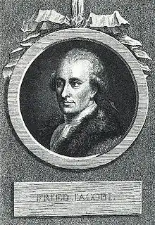 Friedrich Heinrich Jacobi, né à Dusseldorf le et mort à Munich le , est un philosophe et écrivain allemand. Avec ses Lettres à Moses Mendelssohn sur la doctrine de Spinoza (1785), il est à l'origine du « grand débat » qui commence autour de la philosophie de Spinoza en Allemagne à la veille de l'idéalisme allemand (Fichte, Schelling, Hegel)[1].