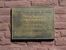 - Plaque commémorative de 1876 aux thermes impériaux. L'histoire du bâtiment est présentée en latin et Ark est nommé maître d'œuvre.