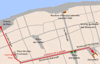 Dans la soirée du , après les représentations, le cirque organise une parade dans la ville de Tours depuis le Champ de Mars en passant par la rue Léon-Boyer, le Boulevard Béranger pour enfin terminer à la gare de Tours où les animaux sont rembarqués dans les wagons. Pour l'occasion, de nombreux Tourangeaux et habitants des communes voisines sont venus admirer ce défilé. Par ailleurs les parades constituent quasiment les seules sorties occasionnelles des bêtes. Lorsque le cortège arrive à la place Nicolas-Frumeaud, Fritz devient incontrôlable pour une raison inconnue. Il aurait, d'après certaines sources, et particulièrement un extrait de presse dans Le Mémorial du Poitou, été brûlé sur la trompe avec un cigare ou aurait avalé une cigarette, ce qui pourrait expliquer l'origine de sa folie[6]. Cependant, il semblerait que cette rumeur ne soit que légende puisqu'aucune source tourangelle d'époque ne la mentionne ; l'hypothèse la plus probable est que l'animal est alors en période de musth, caractérisée entre autres par une forte agressivité. L'éléphant, très imposant, ne peut être maîtrisé et le directeur du cirque prend la décision de l'abattre[3]. Les employés du cirque l'encerclent avec d'autres éléphants pour tenter de le contrôler mais aussi de le faire tomber. Une fois l'éléphant à terre, des chaînes et des cordes reliées à des palans sont enroulées autour de son cou dans le but de l'étrangler. Fritz meurt environ trois heures après[2],[7].