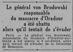 Après la guerre, le général de Lattre affirma dans son Histoire de la 1re armée française[8], publiée en 1949, que le général von Brodowski avait été tué « par une sentinelle sénégalaise » alors qu'il tentait de s'évader de la citadelle de Besançon.