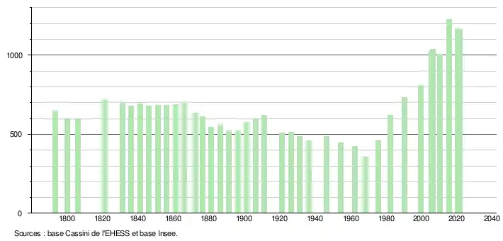 L'évolution du nombre d'habitants est connue à travers les recensements de la population effectués dans la commune depuis 1793. Pour les communes de moins de 10 000 habitants, une enquête de recensement portant sur toute la population est réalisée tous les cinq ans, les populations légales des années intermédiaires étant quant à elles estimées par interpolation ou extrapolation[19]. Pour la commune, le premier recensement exhaustif entrant dans le cadre du nouveau dispositif a été réalisé en 2005[20].