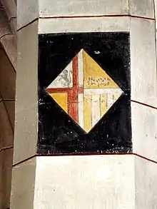 Blason | Bandé d'or et d'azur de six pièces à la bordure engrêlée de gueules[20]. |