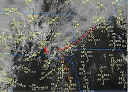 Dans l'image du satellite météorologique ci-contre, il est possible de voir la répartition des masses d'air de part et d'autre d'un front de point de rosée dans la partie inférieure (tireté en brun). La température de surface, en Fahrenheit, est partout près de 85 °F dans le secteur dégagé mais atteint cependant près de 90 °F localement le long de la ligne sèche (ligne en tirets bruns). La variation de température n'est donc pas le facteur déterminant de la position du front. Par contre, les points de rosée sont autour de 63 °F à l'est de la ligne et de 50 °F à l'ouest de celle-ci.