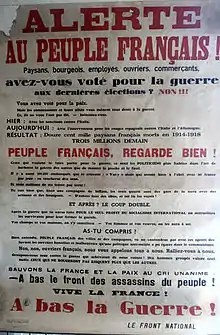 Le Front national ne publie son manifeste qu'en octobre 1934. Il s'oppose au Front commun, au « personnel politique discrédité », à « l'Etat maçonnique, défaitiste, corrompu », réclame « un gouvernement fort, stable et responsable », un système socio-économique corporatiste, le respect de la famille et de la propriété privée, l'enseignement du patriotisme à l'école, le renvoi des fonctionnaires « qui militent contre la France », l'abolition des monopoles et l'interdiction de la fabrication d'armes de guerre par l'industrie privée, une justice indépendante, le châtiment des policiers et magistrats indignes, la défense du territoire français, vitupère « la finance internationale ». Il est signé par les associations adhérentes[15]. Les JP et la Solidarité française. D'autres petits groupements politiques ou civiques : Centre d'action et de documentation contre le marxisme agraire du docteur Henri Martin[16], Centre de défense et d'action nationale contre l'école maçonnique (L'Alerte, d'Émile Bergeron, cadre des JP et du CPRN), Club de l'Effort, fondé par l'ANOC en 1934 et présidé par Jean Ferrandi puis par Paul Chack, Fédération des contribuables de la Seine, Forces nouvelles (groupement alsacien, qui a adhéré en juin, représenté par le jeune avocat Pierre Pflimlin[8]), Ligue de l'appel au peuple (bonapartistes) du général Koechlin-Schwartz, Phalanges universitaires de France (JP), Ordre et bon sens. Des groupements d'anciens combattants et/ou d'officiers : Association des membres de la Légion d'honneur décorés au péril de leur vie du colonel Josse, Association nationale des officiers combattants (ANOC), Groupement des officiers mutilés, Ligue des chefs de section du colonel Fournier, Société des officiers de complément de France, Union nationale des anciens combattants coloniaux, présidée par le lieutenant-colonel Jean Ferrandi[17]. Charles Maurras se réjouit de ce manifeste et affirme que si l'AF ne peut « mettre le commandement de (ses) forces à la disposition d'une fédération d'autres groupements », du fait notamment de ses convictions monarchistes, les membres de l'AF sont pour autant toujours « prêts à toutes les alliances sur des points précis, à toutes les coopérations sur des actions précises »[18].