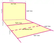Un espace libre de 1,8 mètre en dehors du terrain de jeu est aménagé pour que les joueurs puissent jouer les balles risquant de rebondir deux fois.
