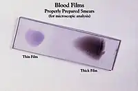 Deux frottis sanguins colorés au Giemsa, un fin et un plus épais.