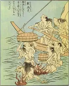 Les funayūrei sont des fantômes supposés utiliser des hishaku (louches) pour remplir d'eau les bateaux et les faire couler. Ils sont censés être les restes de personnes qui ont péri dans des naufrages et tentent d'inciter les humains à les rejoindre[1]. Selon les légendes, il existe différentes méthodes qui peuvent être utilisées pour protéger du mal qu'ils infligent, comme lancer des onigiri à la mer ou préparer un hishaku sans fond. Ils sont aussi appelés mōjabune (亡者船), bōko, ou ayakashi selon les endroits[3]. Les umibōzu, autres étranges phénomènes en mer, sont parfois considérés être un type de funayūrei plutôt qu'un type de yōkai[4].