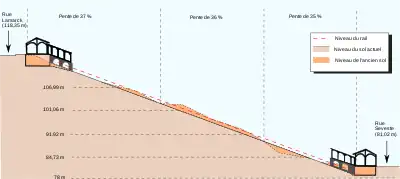 Il gravit les trente-six mètres de dénivelée (pour une longueur de cent-huit mètres) en moins d'une minute trente. Le funiculaire est équipé d'une voie double à l'écartement standard de 1,435 mètre et la rampe atteint 35,2 %[4].