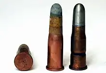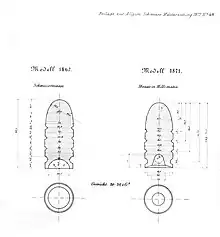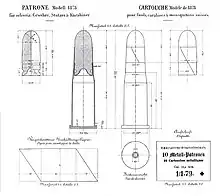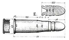 La cartouche était un modèle de mise au point : l'ogive en plomb pur comportait une jupe qui en faisait une balle type Minié. Lors du tir, la jupe s'évasait et empêchait des fuites des gaz par l'avant du canon, améliorant le rendement et la précision. Mais comme les canons n'étaient pas constants, un calepin de papier était ajouté à l'extérieur de l'étui et recouvrait le collet et une partie de l'ogive.