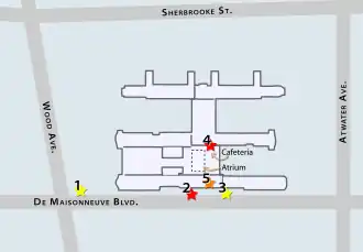 - Les étudiants et le personnel du Collège Dawson ont rapidement fui les lieux. Le Westmount Square et la Place Alexis-Nihon, situés à proximité du collège, ont été évacués. La circulation sur la ligne verte du métro de Montréal a été interrompue et les circuits d'autobus détournés. Lorsqu'elle a repris, aucun arrêt n'était effectué à la station de métro la plus rapprochée du périmètre de sécurité, Atwater, qui est demeurée fermée jusqu'en fin de soirée.