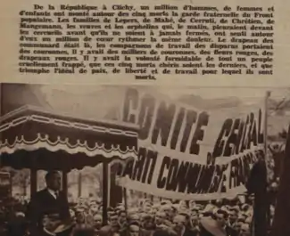 « Le colonel comte Casimir [faux prénom de La Rocque, utilisé par les gauches] de La Rocque, agent des 200 familles et des trusts, peut-il impunément émettre la prétention d'occuper Clichy, où il veut tenir une réunion le 16 mars au cinéma Olympia. Nous répondons : non. Nous prenons nos responsabilités et nous les prenons entièrement : contre le fascisme, pour le pain, pour la liberté, pour la paix [slogan du Front populaire de 1936]. Le maire, le conseiller général, le député de la circonscription invitent la population laborieuse (...), tous les républicains, tous les démocrates, à se rassembler le mardi 16 mars dès 19 heures, à la mairie de Clichy, afin de montrer massivement aux ennemis du peuple que la place des représentants du capital et du fascisme international, est ailleurs qu'au centre d'une ville qui entend vivre libre[6]. »
