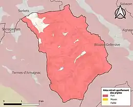 Le retrait-gonflement des sols argileux est susceptible d'engendrer des dommages importants aux bâtiments en cas d’alternance de périodes de sécheresse et de pluie. 94,4 % de la superficie communale est en aléa moyen ou fort (94,5 % au niveau départemental et 48,5 % au niveau national). Sur les 70 bâtiments dénombrés sur la commune en 2019, 60 sont en aléa moyen ou fort, soit 86 %, à comparer aux 93 % au niveau départemental et 54 % au niveau national. Une cartographie de l'exposition du territoire national au retrait gonflement des sols argileux est disponible sur le site du BRGM[19],[Carte 3].