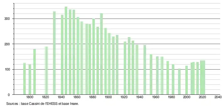 L'évolution du nombre d'habitants est connue à travers les recensements de la population effectués dans la commune depuis 1793. Pour les communes de moins de 10 000 habitants, une enquête de recensement portant sur toute la population est réalisée tous les cinq ans, les populations légales des années intermédiaires étant quant à elles estimées par interpolation ou extrapolation[22]. Pour la commune, le premier recensement exhaustif entrant dans le cadre du nouveau dispositif a été réalisé en 2008[23].