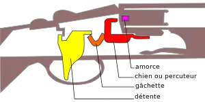 La gâchette accroche le chien. Lors de l'appui sur la détente, celle-ci fait pivoter la gâchette qui libère alors le chien (aussi appelé marteau ou percuteur).