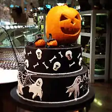 Le gâteau d'Halloween est préparé avec les symboles et les thèmes d'Halloween. Il peut être préparé avec une coloration orange et noire au niveau du gâteau et du glaçage[1], car la couleur orange est de manière traditionnelle associée aux citrouilles d'Halloween[2],[3] qui sont utilisées pour créer des jack-o'-lanterns[4]. Le noir est une autre couleur traditionnelle d'Halloween[3],[4] souvent associé au thème des cimetières, entre autres. Des colorants peuvent être utilisés dans le glaçage[1],[5]. Les gâteaux aux carottes sont parfois préparés comme des gâteaux d'Halloween[6],[7] par leur coloration orange. Ils sont parfois préparés comme gâteaux aux épices, gâteaux au chocolat[8], gâteaux au pudding[9], et cheesecakes. Le gâteau d'Halloween peut être préparé en tant que layer cake[10] et également en tant que cake pop[11] et cupcake.