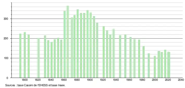 L'évolution du nombre d'habitants est connue à travers les recensements de la population effectués dans la commune depuis 1793. Pour les communes de moins de 10 000 habitants, une enquête de recensement portant sur toute la population est réalisée tous les cinq ans, les populations légales des années intermédiaires étant quant à elles estimées par interpolation ou extrapolation[29]. Pour la commune, le premier recensement exhaustif entrant dans le cadre du nouveau dispositif a été réalisé en 2005[30].