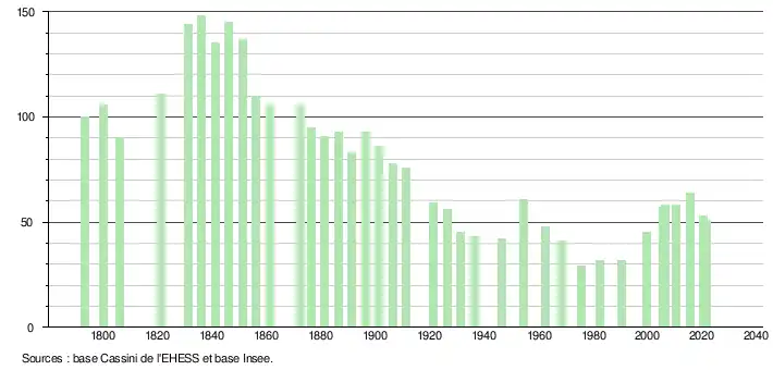 L'évolution du nombre d'habitants est connue à travers les recensements de la population effectués dans la commune depuis 1793. Pour les communes de moins de 10 000 habitants, une enquête de recensement portant sur toute la population est réalisée tous les cinq ans, les populations légales des années intermédiaires étant quant à elles estimées par interpolation ou extrapolation[28]. Pour la commune, le premier recensement exhaustif entrant dans le cadre du nouveau dispositif a été réalisé en 2005[29].